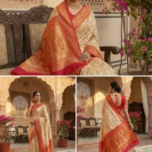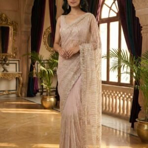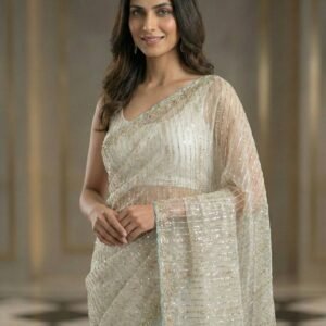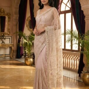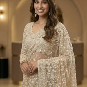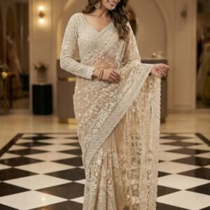 Beige Net Heavy Hand Embroidery Saree With Readymade Blouse