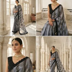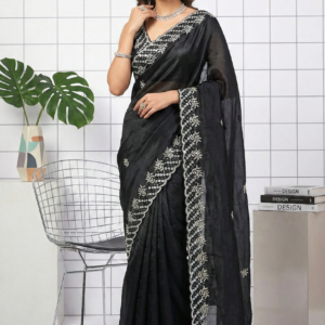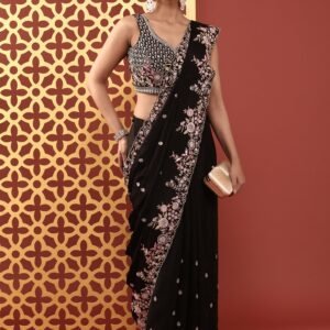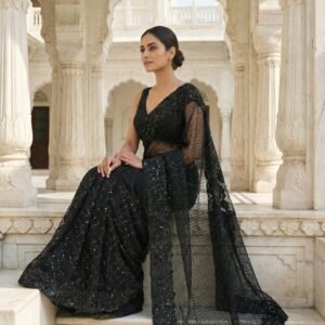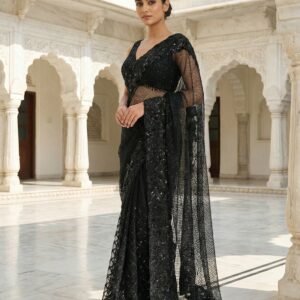 Black Net Heavy Floral Sequins And Beads Saree With Readymade Blouse