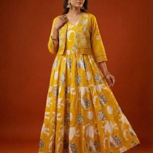 Mustard Cotton Floral Digital Print Long Dress