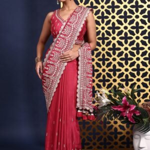 Pink Satin Stone And Thread Embroidery Saree